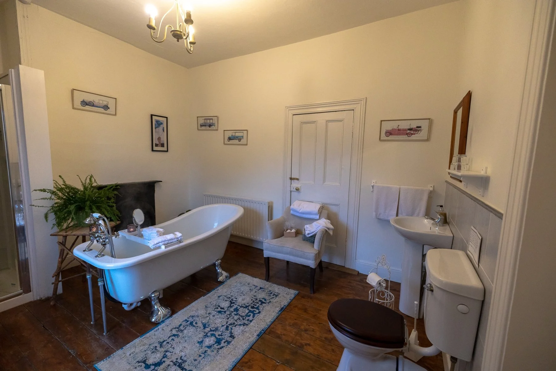 It boasts high ceilings, a beautiful view over garden and grounds, an old-style fireplace and a large, luxurious bathroom with a stand alone bathtub.